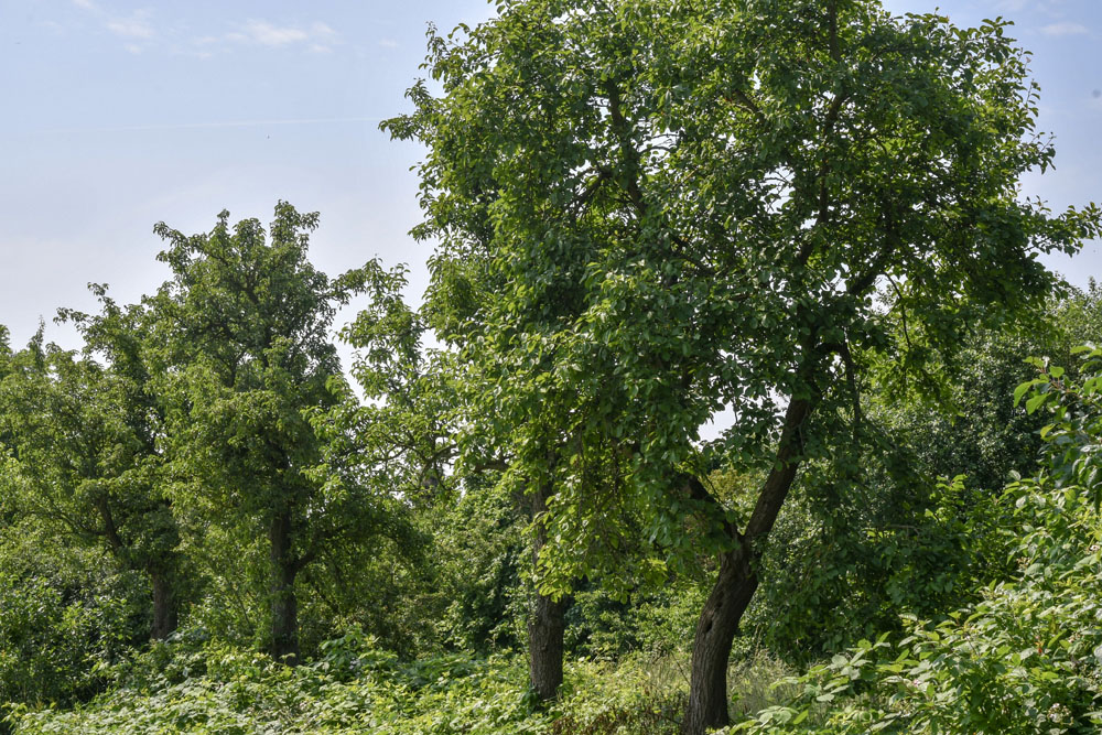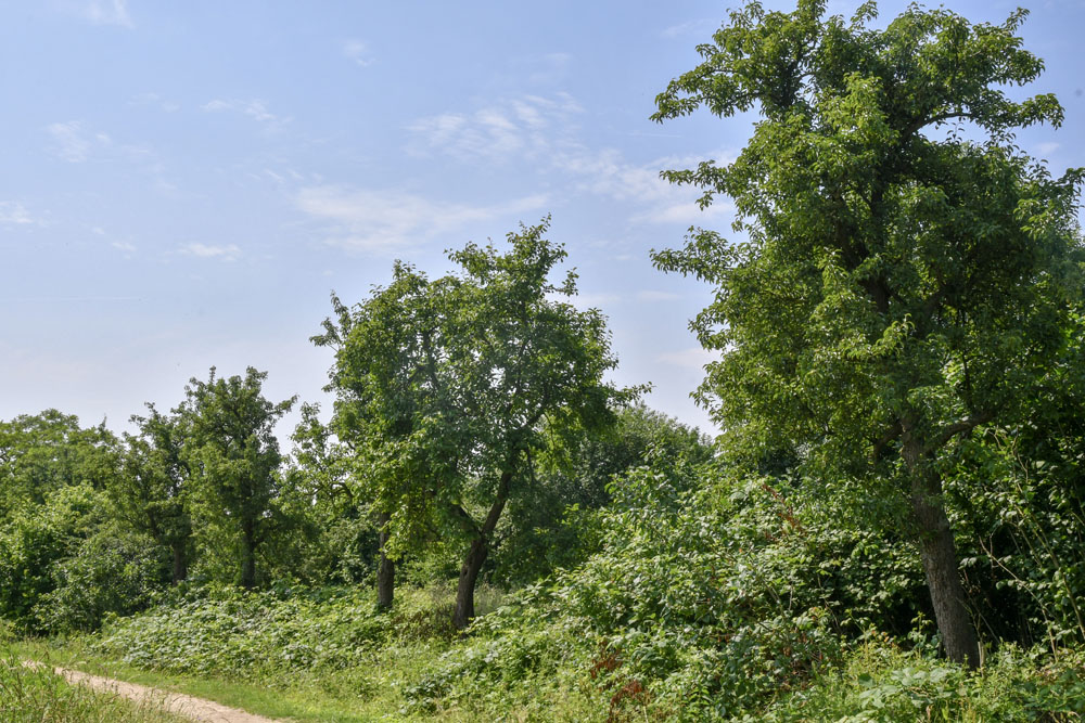 13 Zone E: rij oude perenbomen met erachter hondenlosloopterrein
