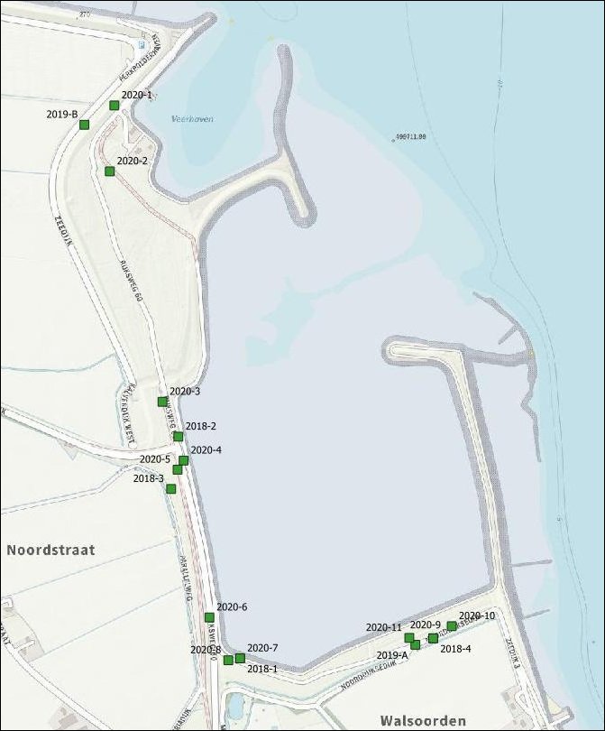 3 Kaart 3: overzicht met 11 onderzoekslocaties in 2020, 2 locaties in 2019 (A en B) en 4 locaties in 2018