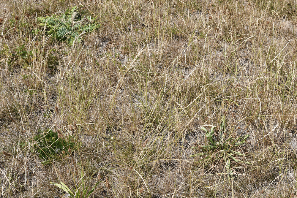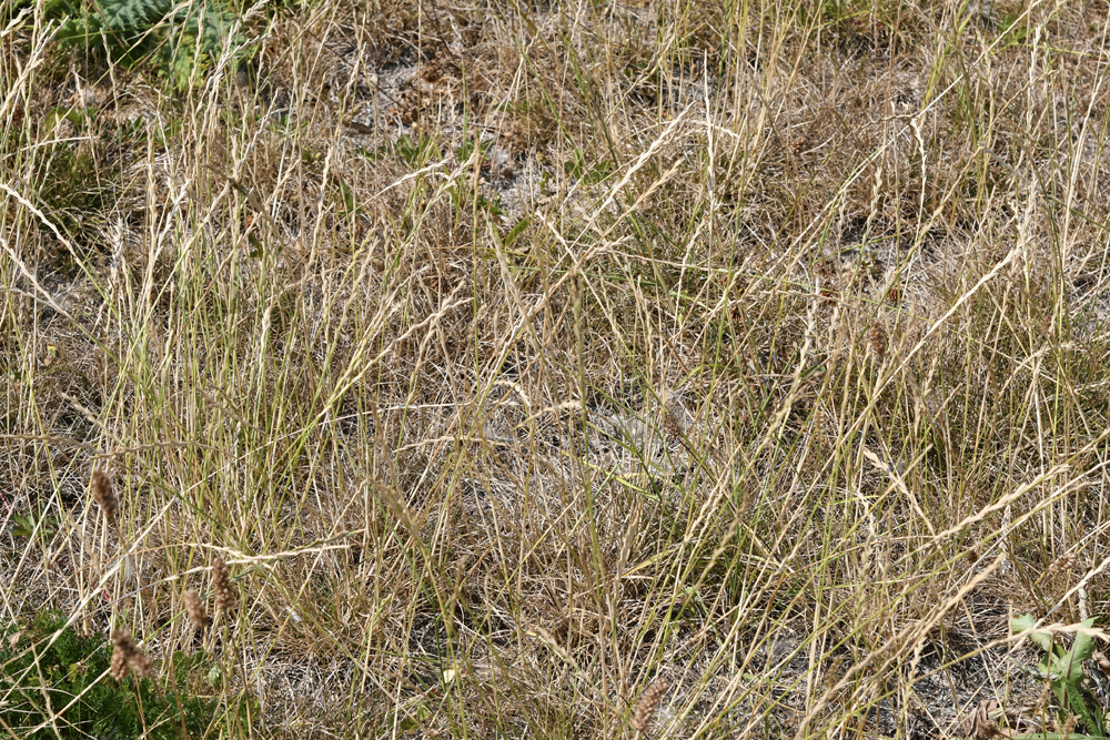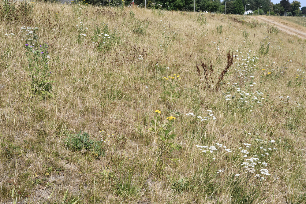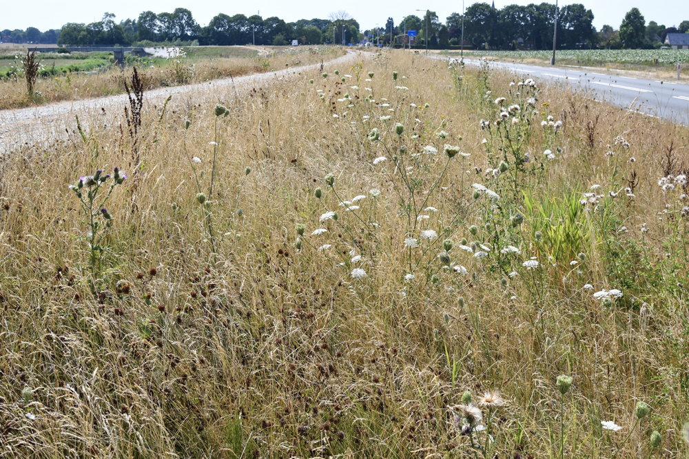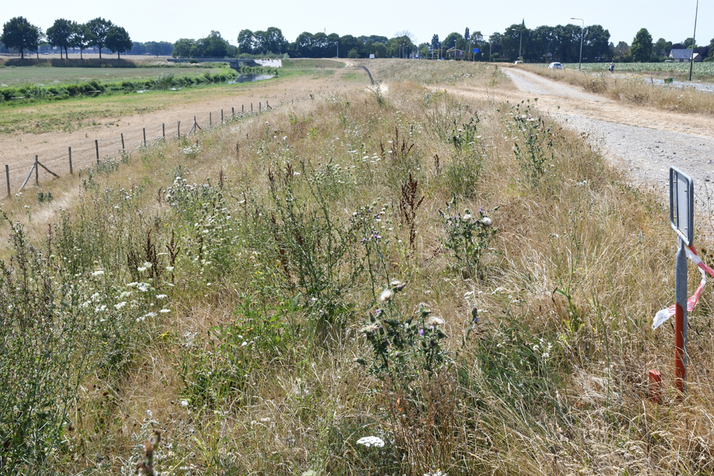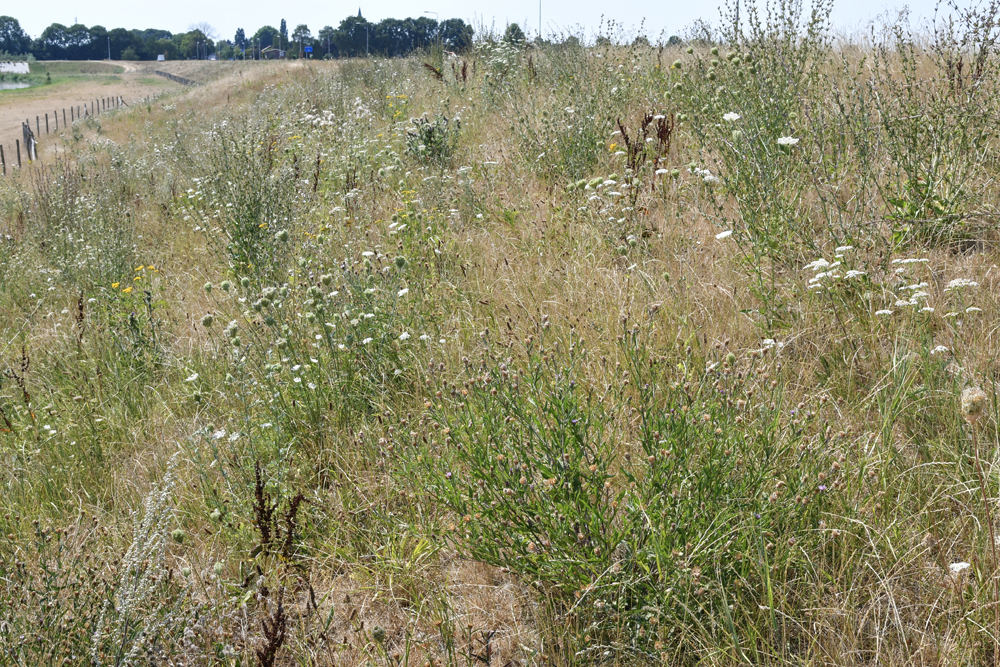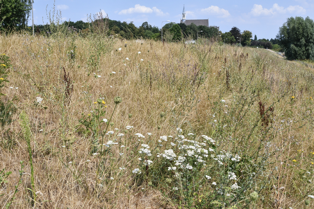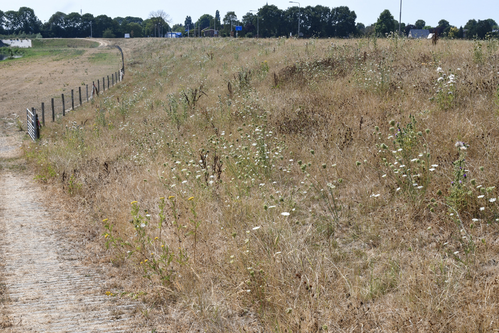1 De dijkvegetatie is nu grotendeels uitgebloeid en lijkt sterk verdroogd als gevolg van de langdurige, droge periode
