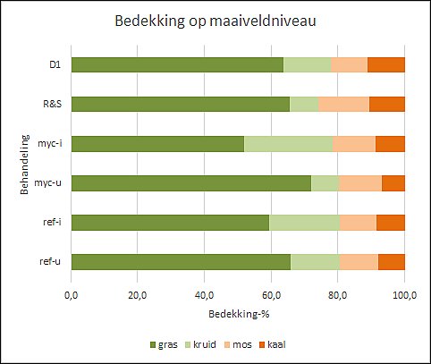 Het aandeel van de kale plekken is het hoogst bij inzaai met D1 (11,3%) en het laagst bij mycorrhiza in de niet geklepelde zone (myc-u: 6,9%).