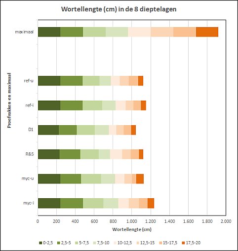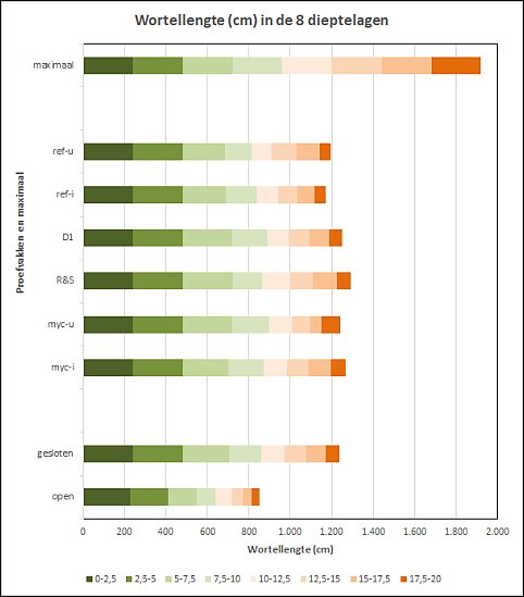 Behandeling met Root & shoot heeft nu de hoogste totale wortellengte (1.292 cm), het referentievak in de geklepelde zone de laagste (ref-i: 1.172 cm).