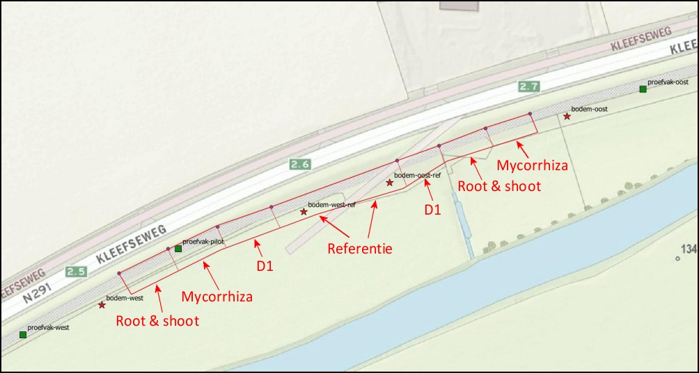 2 Ligging van vakken met de verschillende behandelingen en de 3 proefvakken en de 4 locaties van de bodemmonsters
