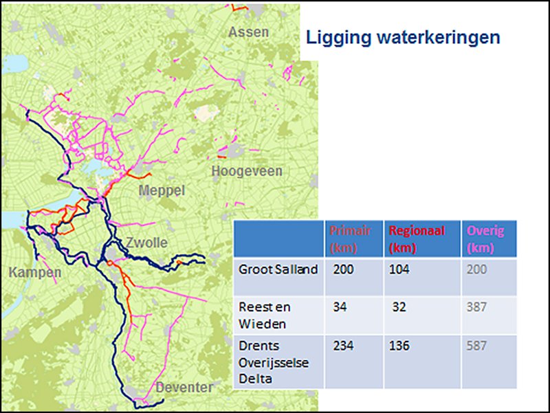 Waterschap Drents Overijsselse Delta beheert in haar werkgebied 234 km aan primaire waterkeringen en 136 km regionale waterkeringen.